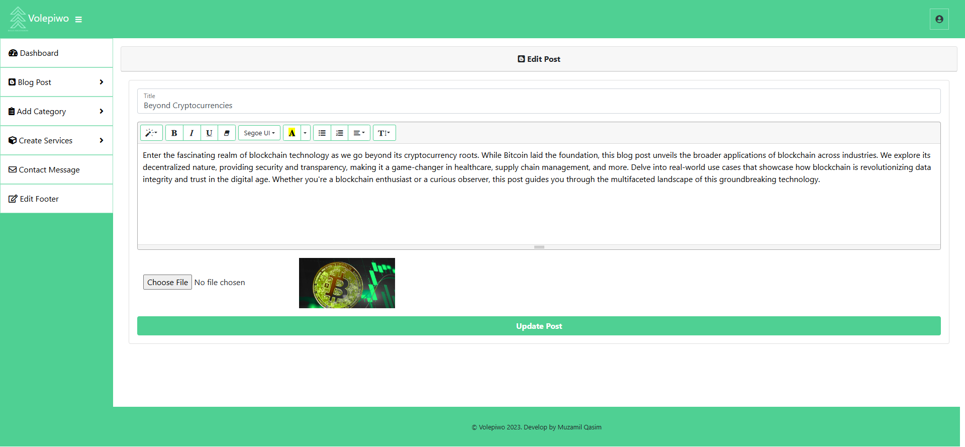 Volepiwo is a PHP-OOP website project with custom features and design. Volepiwo includes a robust and interactive blog page where users can explore a diverse range of articles and posts. Highlighting the core offerings, the services section provides detailed information about the products or services offered. The contact page is a vital component of Volepiwo, offering a convenient way for visitors to get in touch with you. Enhancing user experience, Volepiwo integrates a powerful search filter that allows users to quickly find specific content or information. This feature facilitates efficient navigation and helps users access relevant data with ease.